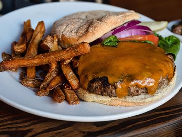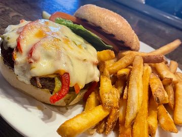 Burg's signature blend of prime angus steak, ground in house then grilled to perfection. Served on a toasted kaiser roll, with your choice of American, Swiss, pepper jack, or cheddar cheese. Served with a side of fresh cut fries. Add two thick cut slices of hardwood smoked brown sugar cured bacon for $3.