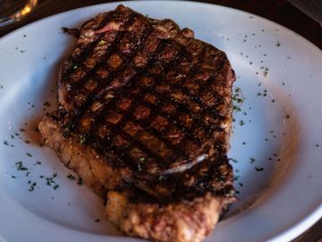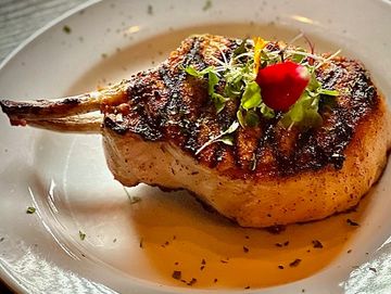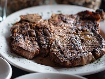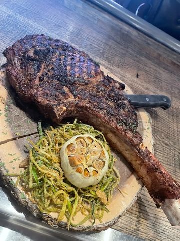 40oz. A colossal steak well marbled, rich and buttery with a long French trimmed bone that steak lovers use as a handle when feasting on this ribeye.