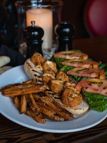 Burg's twist on a traditional Po-Boy sandwich, stuffed with Cajun seasoned fried shrimp, dressed with our house remoulade, and served on a toasted baguette with a side of fresh cut fries.