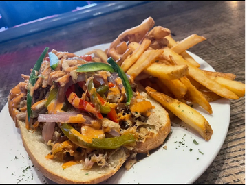 Slow roasted pulled pork with jalapenos, sautéed peppers & onions, our signature BBQ sauce, topped with crispy onion straws. Served on a toasted hoagie roll with a side of fresh cut fries.